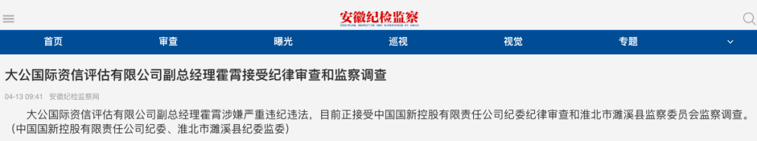 据安徽纪检监察网4月13日消息, 大公国际资信评估有限公司副总经理霍霄涉嫌严重违纪违法,目前正接受中国国新控股有限责任公司纪委纪律审查和淮北市濉溪县监察委员会监察调查。